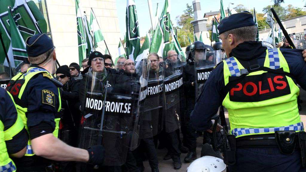 Image copyright Reuters Image caption Some NMR members were equipped with full riot gear, including shields A rally of neo-Nazis in Sweden has ended in clashes with both anti-fascist counter-demonstrators and police.The Nordic Resistance Movement (NMR) group had planned a