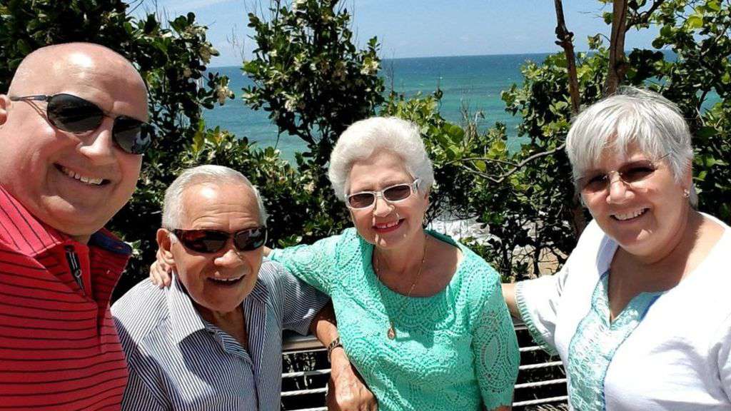 Image copyright Cristina Cabrero Image caption Juan Molina (L), who requires cancer treatment in Puerto Rico, with his wife Teresa (R) and parents. When Hurricane Maria hit Puerto Rico at the weekend, Sofia Abregu filmed it. "Now the water is