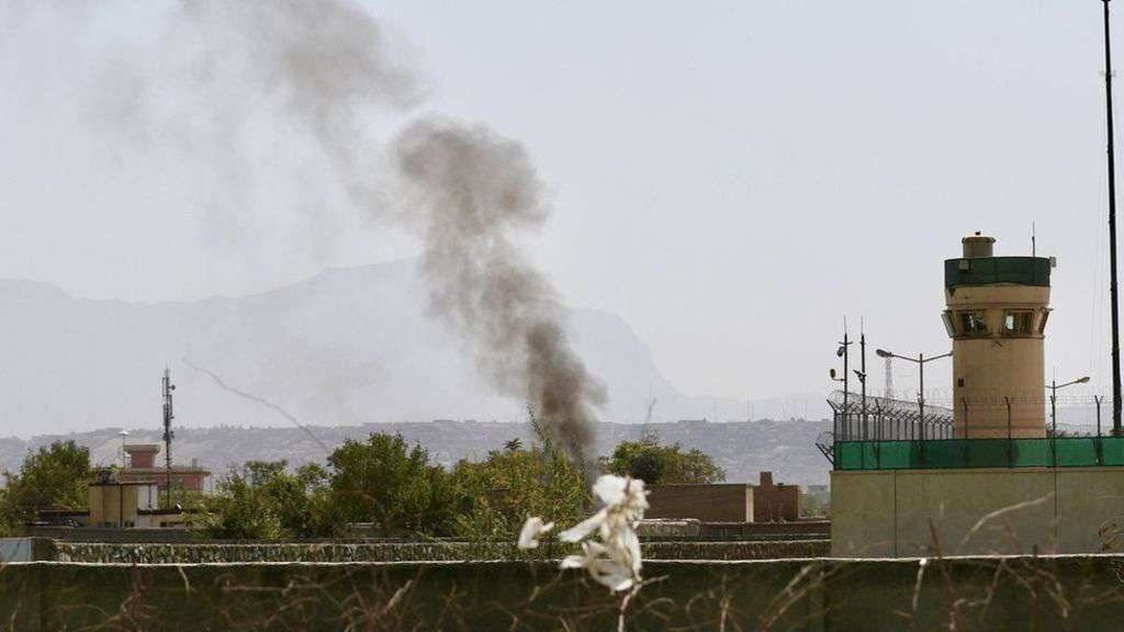 Image copyright EPA Image caption Smoke could be seen above Kabul airport after the attack by insurgents A US air strike against militants in the Afghan capital Kabul caused civilian casualties after a missile malfunctioned, officials said.The strike was in