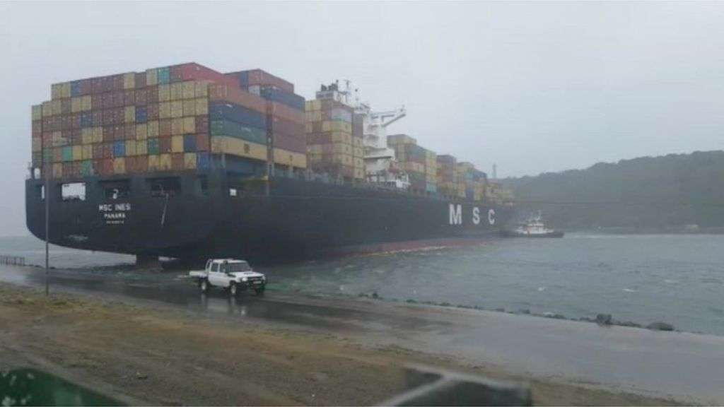Image copyright Blue Security via Reuters Image caption A container ship blocked the harbour mouth after drifting away Moored ships were blown away as a "supercell thunderstorm" swept through South Africa's KwaZulu-Natal region, killing at least eight people.The dead include