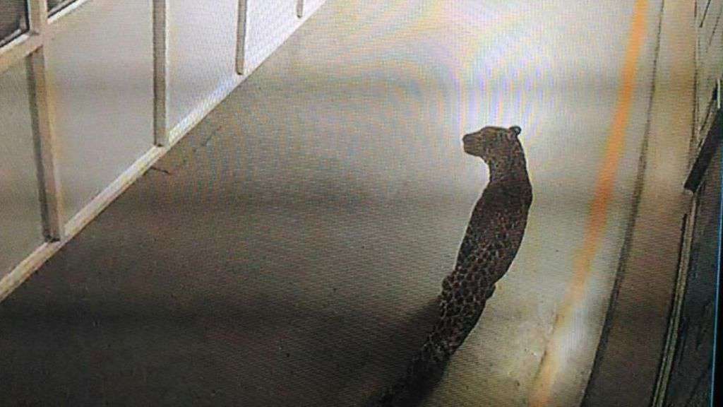 Image caption The leopard caught on the CCTV camera at Maruti Suzuki's Manesar factory Wildlife officials in India have rescued a leopard nearly 36 hours after it was first spotted in a car factory.Rescuers tranquilised the animal after a massive