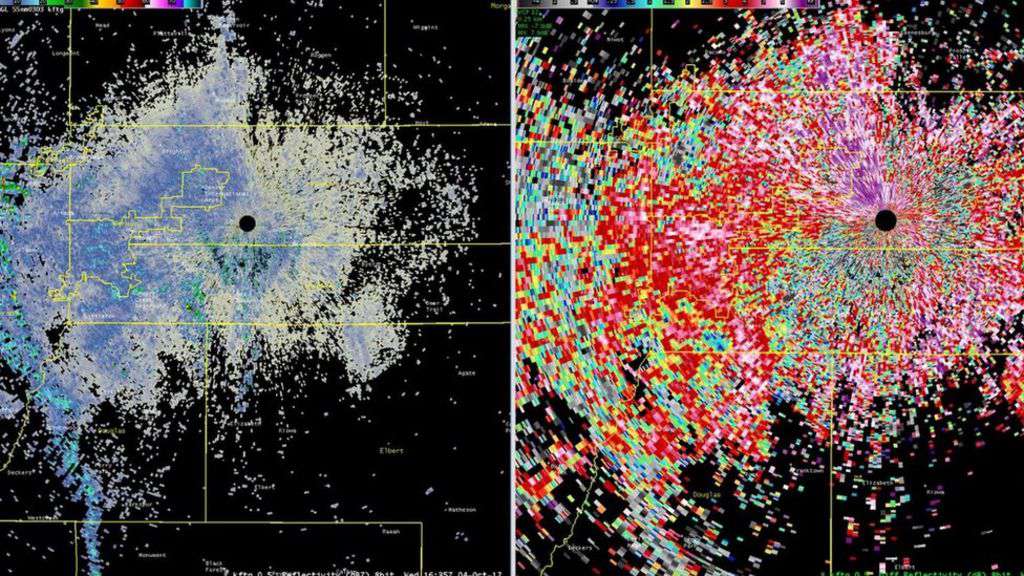 Image copyright NWS Image caption Birds (left) leave a different radar signature to butterflies A colourful, shimmering spectacle detected by satellites over the US state of Colorado has been identified as swarms of migrating butterflies.Scientists at the National Weather Service