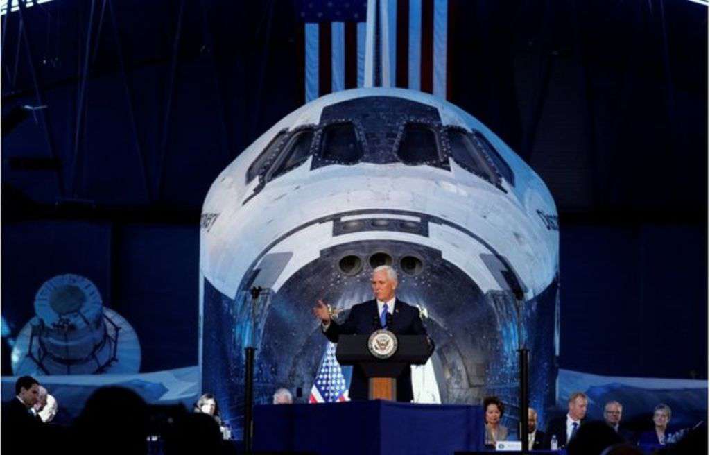 Image copyright Reuters Image caption Mike Pence delivers his statement in front of Space Shuttle Discovery US Vice-President Mike Pence has expressed the intention for America to send humans back to the Moon's surface.Speaking to the National Space Council, the