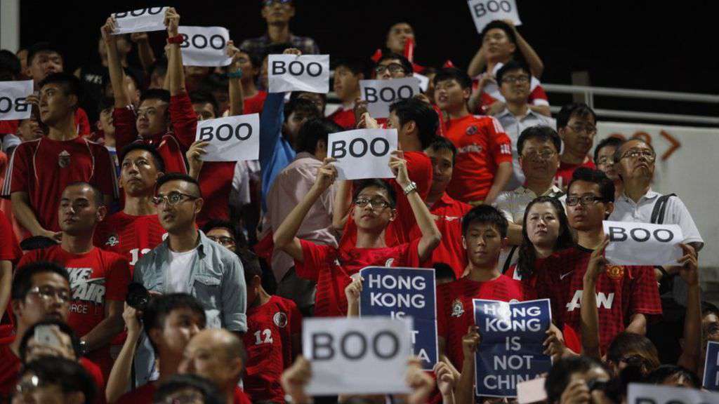 Image copyright AFP Image caption Fans held up signs saying "boo" or "Hong Kong is not China" during a world cup qualifier in 2015 A group of Hong Kong football fans have booed their national anthem - which the territory