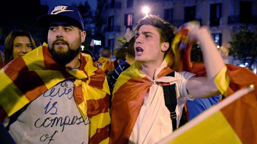 Image copyright AFP Image caption Protesters wave Spanish flags at a demonstration defending unity on Wednesday Spain's government has said it will not accept "blackmail" after the Catalan leader indicated that independence could be declared next week.Carles Puigdemont must return