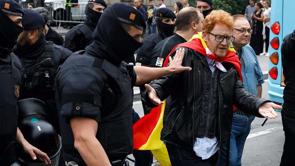 Media playback is unsupported on your device Media captionRiot police were seen using batons to block voting The sight of masked police smashing their way into polling stations was evidence - if any were needed - that Catalonia's independence drive