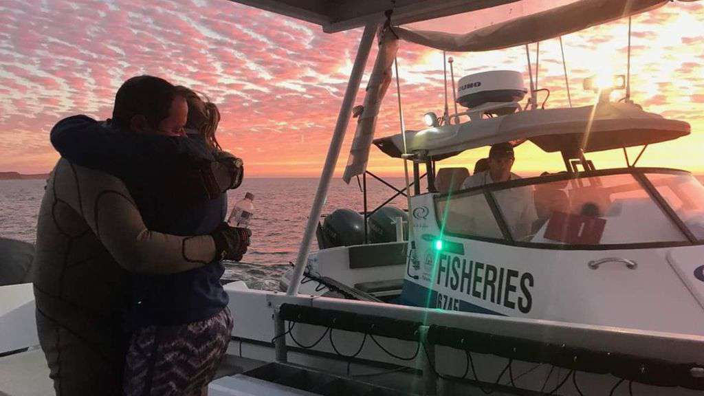 Image copyright GLEN RIDGLEY Image caption John Craig embraces his wife after his long swim to safety A British diver says he swam 7.5km (4.5 miles) to safety off the coast of Australia after losing sight of his boat and