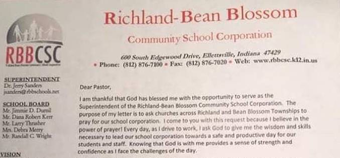 ELLETTSVILLE, Ind. -- A Washington, D.C.-based humanist organization recently sent a letter of complaint to an Indiana school superintendent after learning that he used official letterhead to send correspondence to area pastors to request regular prayer for students, teachers and