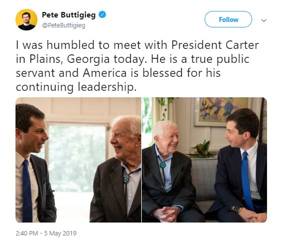 Photo: Twitter screenshot (Business Insider) -- Mayor Pete Buttigieg and his husband, Chasten, recently visited Jimmy Carter's Sunday-school class in Plains, Georgia, and then had lunch with the former president. The South Bend, Indiana, mayor said he was "humbled" to