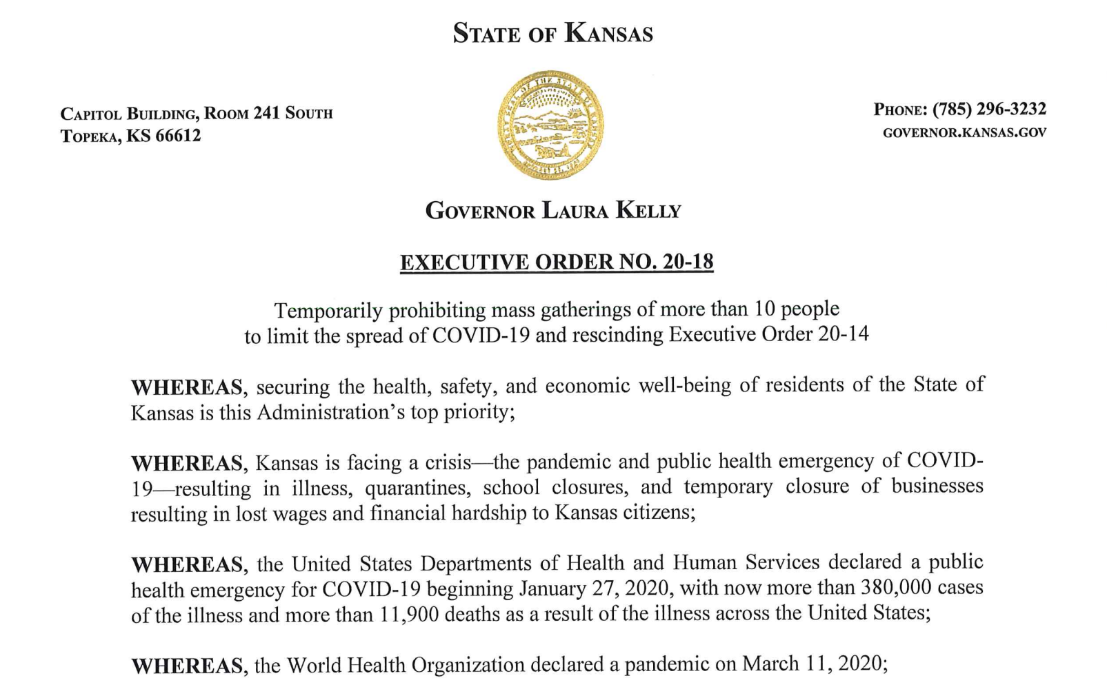 TOPEKA, Kan. — A federal judge has indicated that Kansas Governor Laura Kelly’s order limiting in-person attendance at religious services or activities to 10 people is likely unconstitutional, blocking its enforcement against two churches. Kelly’s order, which was issued in response
