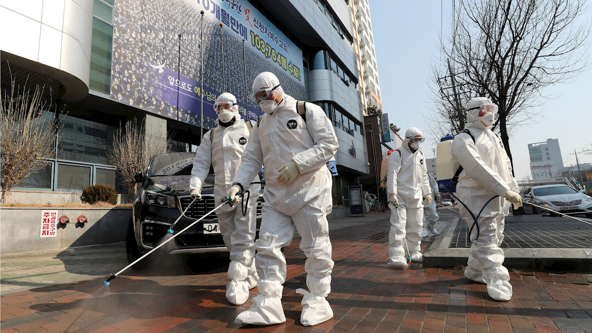 Workers wearing protective gears spray disinfectant against the coronavirus in front of a Shincheonji church in Daegu, South Korea.