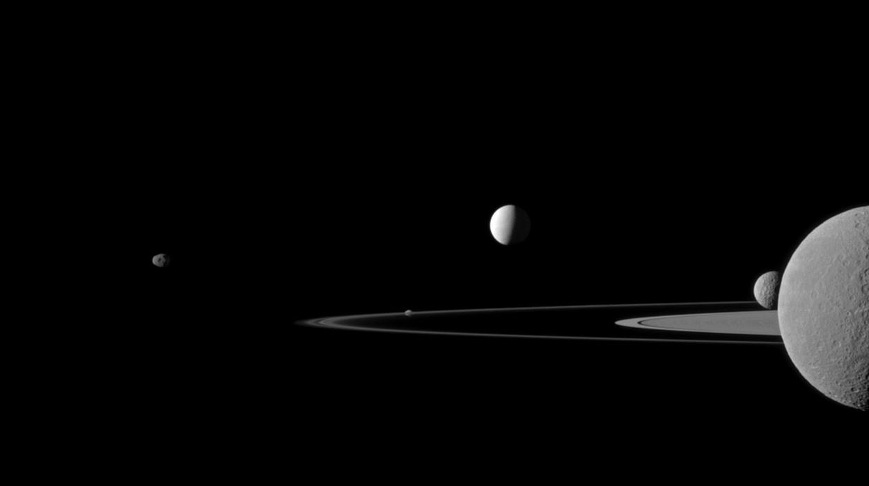 La relación entre Saturno y Encélado es muy distinta a la que hay entre la Tierra y la Luna. Por ejemplo, un gran geiser de su polo sur, el mismo que sirvió para descubrir que bajo la superficie helada de Encélado existe un océano global de agua líquida, dispara continuamente partículas de agua al espacio. Tantas, que han sido suficientes para crear uno de los anillos (concretamente, el «E») de Saturno.