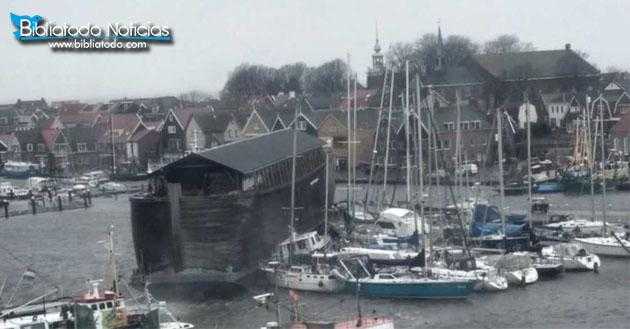 Una enorme réplica del Arca de Noé se desprendió de sus amarras en el puerto holandés de Urk, dañando varios barcos al estrellarse contra los barcos circundantes.