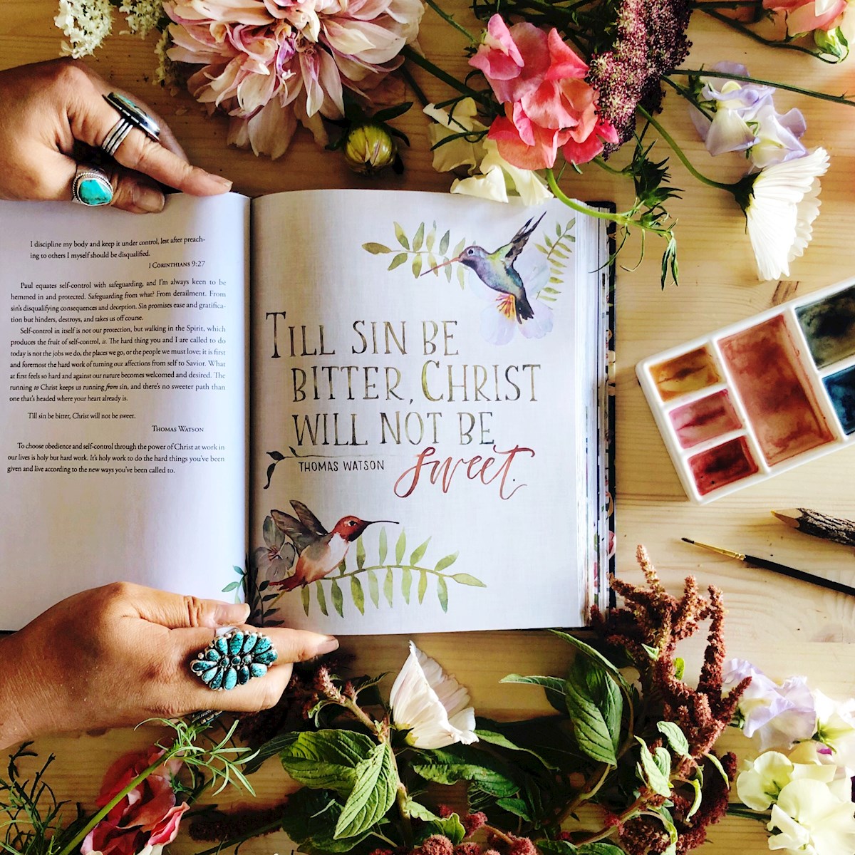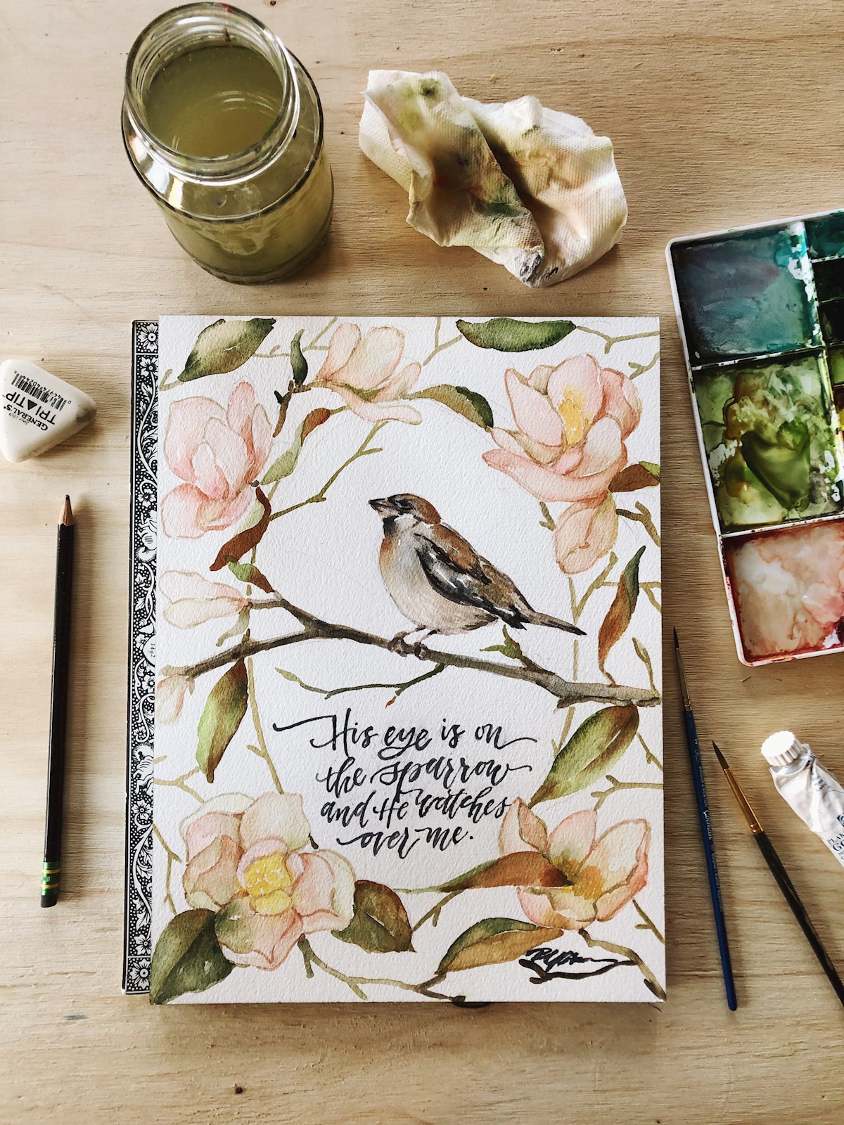 Her feed is populated mostly by beautifully staged photos of her artwork: intricate eight-by-ten-inch paintings of Scripture in calligraphy, usually with the backdrop of natural beauty (flowers, creatures, colors). Sometimes it’s not Scripture, but a hymn lyric or a theological quote.