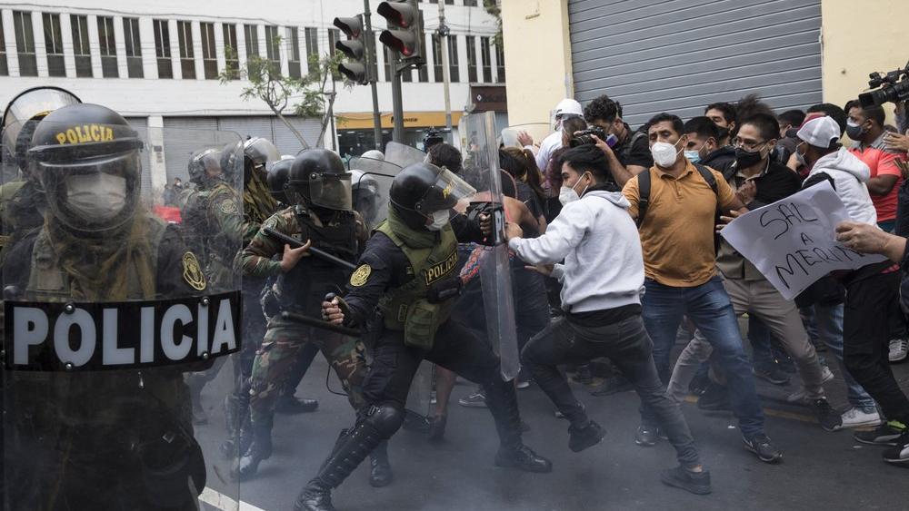 La policía impide a partidarios del expresidente de Perú, Martín Vizcarra, marchar al Congreso, donde los legisladores votaron la noche anterior para destituir a Vizcarra de su cargo en Lima, Perú, el martes 10 de noviembre de 2020. (AP Foto/Rodrigo