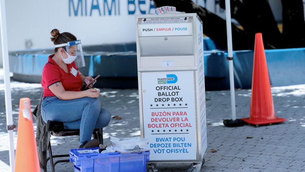 En esta foto de archivo del 7 de agosto de 2020, un trabajador electoral monitorea una urna, identificada en inglés, español y criollo haitiano, para recibir boletas por correo fuera de una mesa de votación durante la votación anticipada en