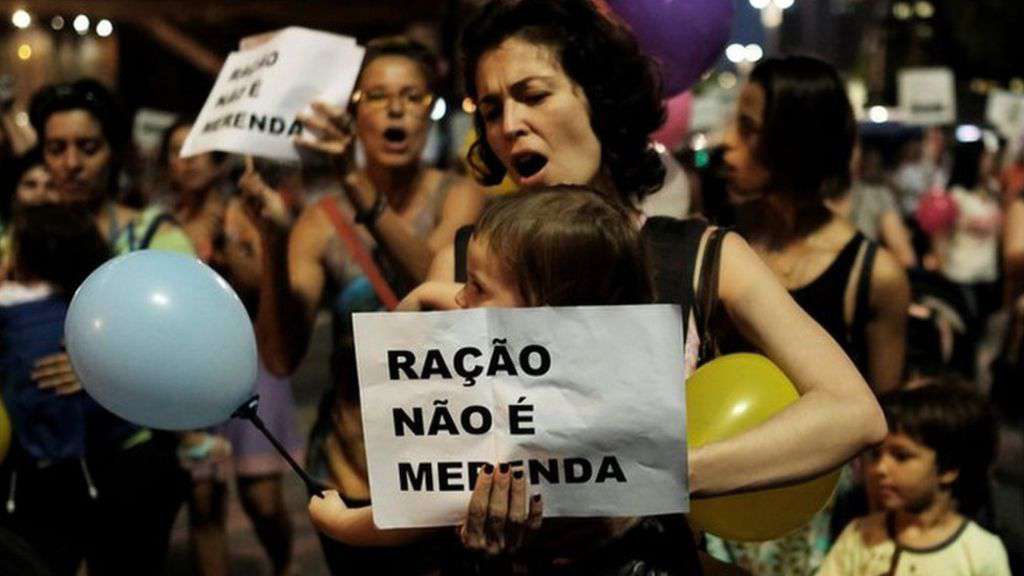 Image copyright Reuters Image caption A woman holds up a placard reading "food pellets are not a meal" during a protest Plans to feed poor children reconstituted food made from leftovers near expiry have sparked a growing row in the