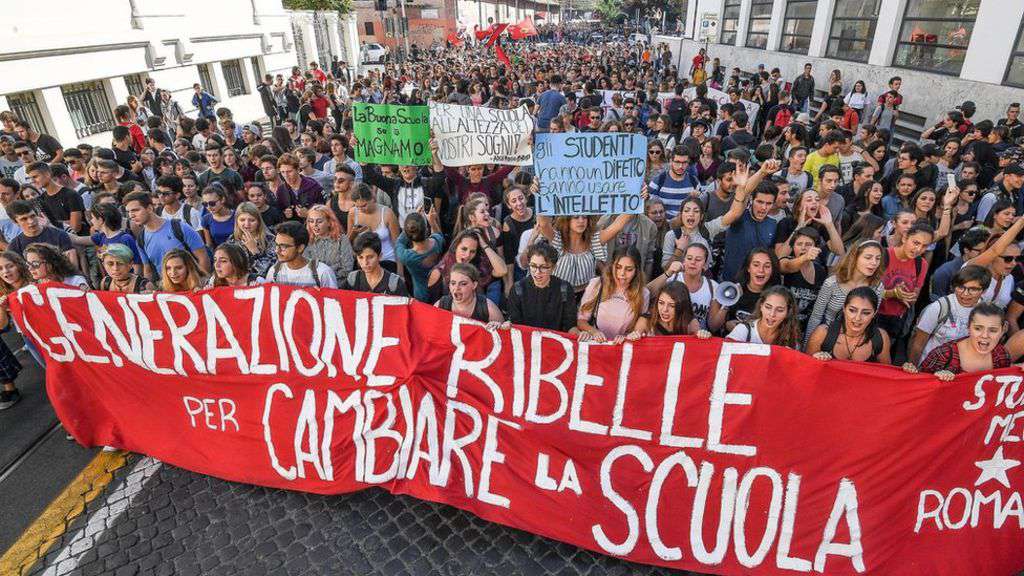 Image copyright EPA Image caption Rome: The banner says students are rebelling to change schools Thousands of Italian school students are protesting nationwide over work placements which they say contribute little to their future job prospects.The students are calling it