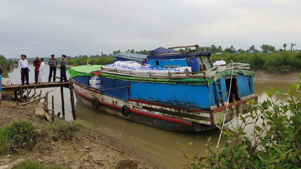 Image copyright Myanmar Government Information Committee Image caption Myanmar's Information Committee posted a picture to Facebook which it said was of the boat carrying ICRC supplies Police in Myanmar's Rakhine state have fired warning shots to disperse a Buddhist mob