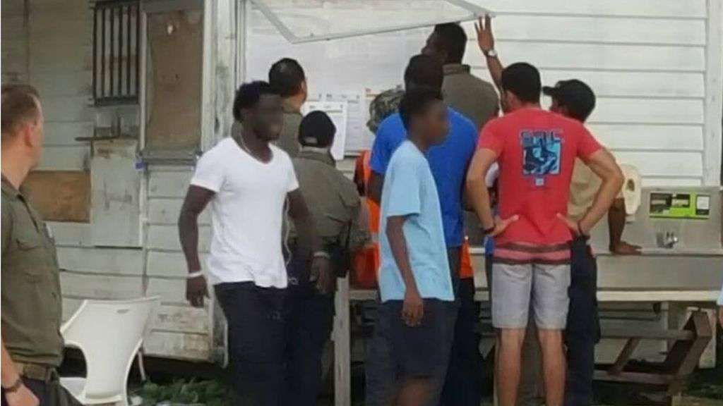 Image copyright REFUGEE ACTION COALITION Image caption Refugees at Manus detention centre checking for news of the US resettlement deal A group of refugees from Australia's offshore detention centres have become the first to be accepted by the US under