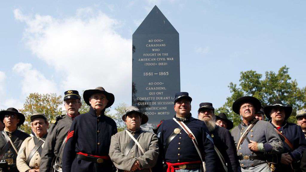Image copyright Reuters Image caption Members of the Grays and Blues pose in front of the monument Canada has unveiled its first monument to the US Civil War, honouring the 40,000 Canadians who fought during America's bloodiest conflict. The monument
