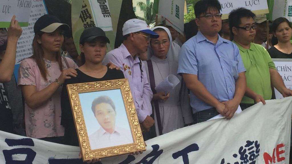 Image caption Nguyen Quoc Phi's sister and father (second and third from left) took part in a protest calling for answers Footage apparently showing police and paramedics failing to give medical treatment to a Vietnamese migrant worker, who had been