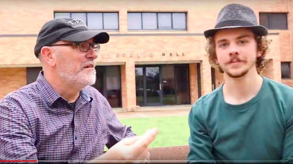 On a bench in the foreground, LeTourneau University campus pastor Pat Mays welcomes viewers and announces an update on a recent mission trip to Mexico. He shouts and snaps his fingers. There’s a quick cut, some editing magic, and freshman Wil Manchester jumps from the distant background to appear on the bench next to Mays, wearing a fedora and ready to share his experience on the spring break trip.