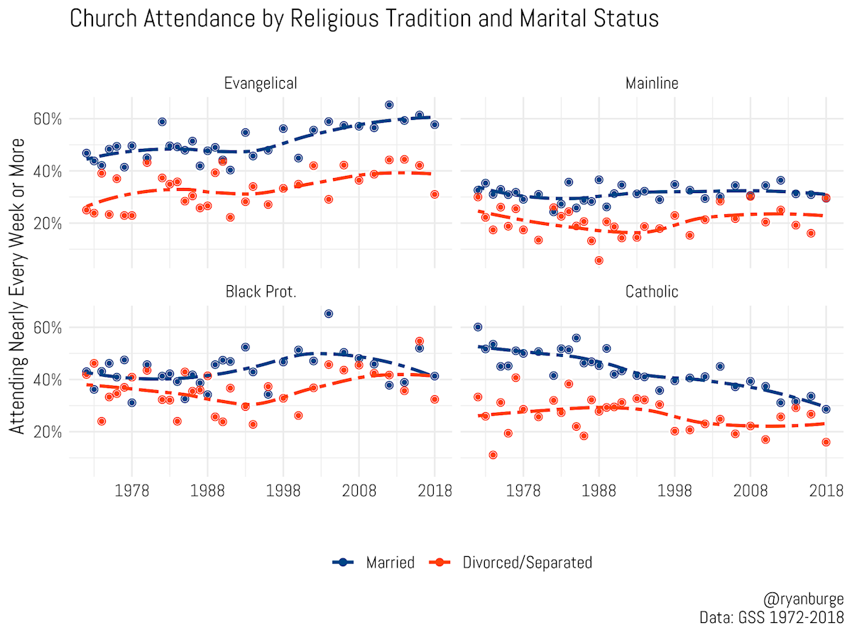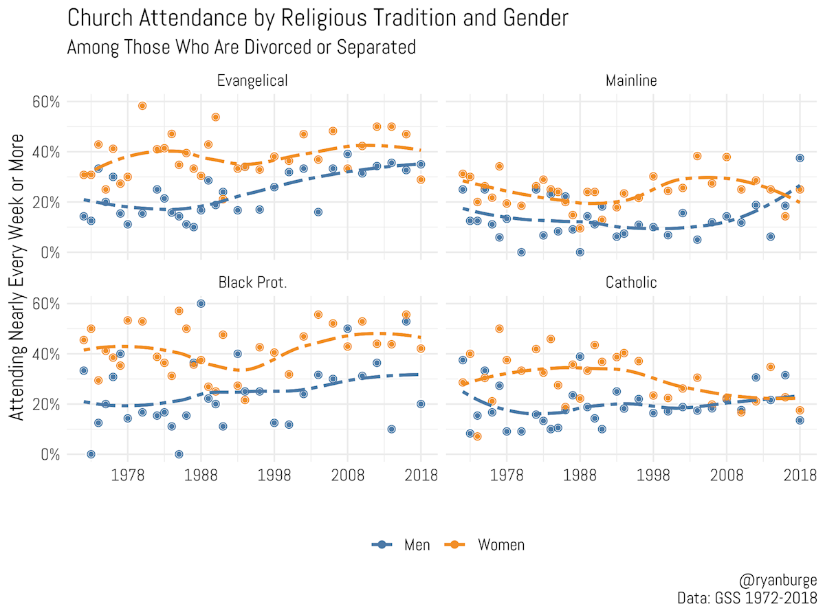 For both mainline Protestants and Catholics, attendance is much lower across the board. However, both groups have seen an interesting recent development. While, historically, divorced women were consistently more likely to be church attenders than divorced men, the lines have converged in the past five years. Now there is no essentially no gender gap in these traditions. Attendance among divorced Catholic women has declined significantly since the mid-1990s.
