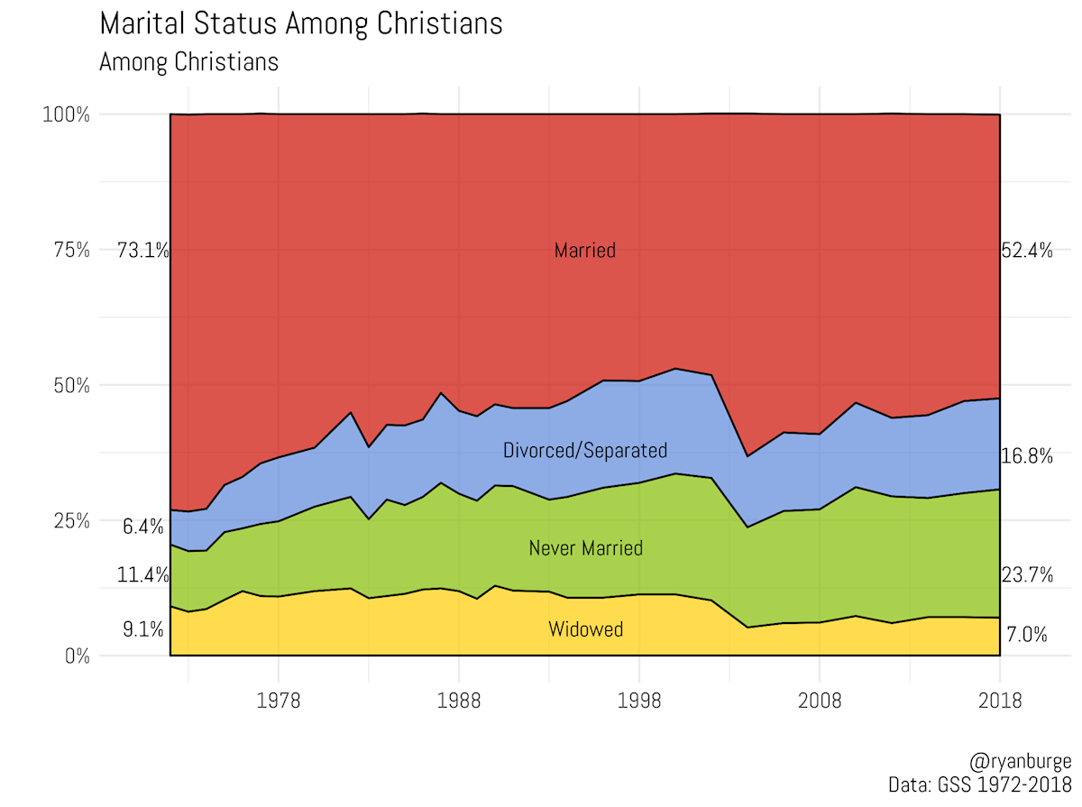 The common assumption that the vast majority of Christians are married used to be true but is no longer the case. In 1972, nearly three quarters of all Christians were married (73.1%); however, that has declined by over 20 percentage points in the past four decades.