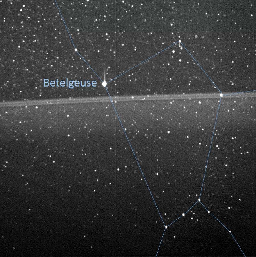 La foto, que se tomó usando la cámara de seguimiento de estrellas, también muestra parte de la constelación de Orión, incluida la estrella brillante Betelgeuse y las tres estrellas del cinturón de Orión.