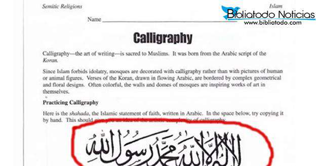 De acuerdo con el sitio ‘Christian Post’, la hija de Rich Penkoski, Brielle, recibió un paquete de su profesora Katherine Hinson, en la escuela secundaria ‘Mountain Ridge’, en Gerrardstown a principios de esta semana que detallaba la historia del Islam, del profeta Mahoma y los cinco pilares de la fe islámica. A partir de ahí, los alumnos fueron instruidos a practicar la caligrafía manualmente, escribiendo uno de los pilares – declarando la creencia en un Dios verdadero y afirmando que Mahoma era un mensajero de Dios.
