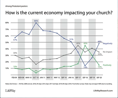 The 2020 negative numbers are the highest since January 2016, when 51% of pastors said the economy was hurting their church.