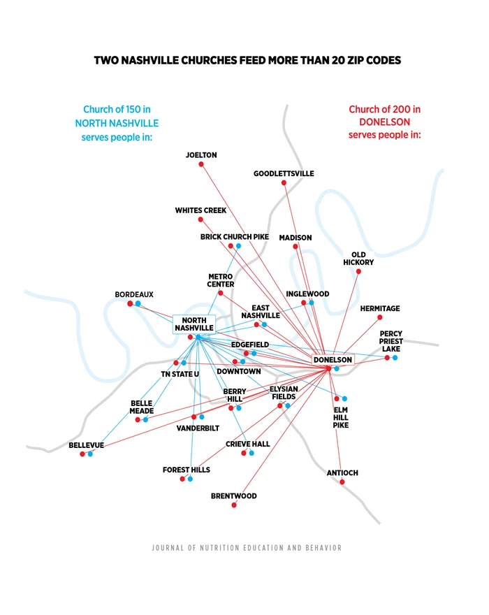 The food pantries of medium-size churches in Nashville serve people in an average of 7 or 8 zip codes, the Journal of Nutrition Education and Behavior study found. Two churches have a much larger reach, serving families in 20 zip codes. The food pantries of large churches, defined as those with 300 members or more, serve slightly smaller areas, feeding people in an average of 6 zip codes. Small churches, with fewer than 100 members, serve people in 3 zip codes.