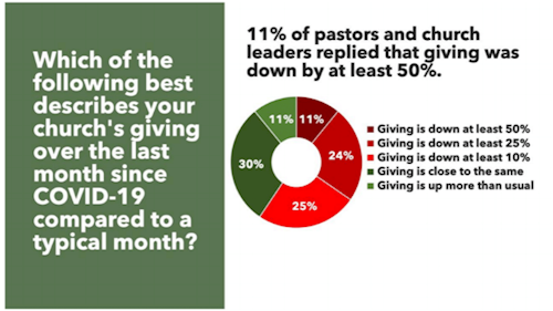 While 30 percent of pastors and church leaders reported that giving was close to the same, over 60 percent have seen their giving go down. This includes a quarter (25 percent) saying that giving was down at least 10 percent and nearly another quarter (24 percent) at least 25 percent. Most concerning is the 11 percent of pastors and church leaders who replied that giving was down by at least 50 percent.