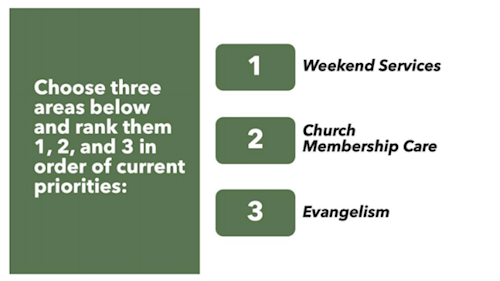 Thus, when we asked pastors and church leaders to rank their three top current priorities, the weekend service and church membership care were the far most common top priority (30 percent and 29 percent respectively) followed by evangelism (18 percent). No other selection registered above six percent as a top priority.