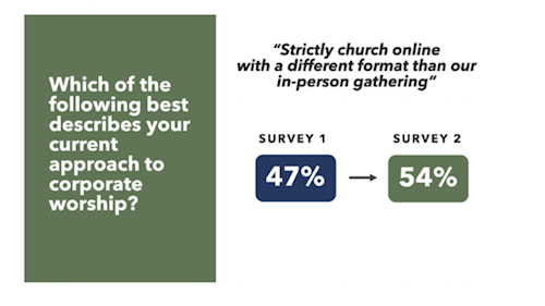 Moreover, among the pastors and church leaders who completed both surveys, 15 percent have changed their in-person gathering format to a different one. In essence, an increasing percentage of pastors and church leaders are experimenting with different online formats to find the expression that best suits their members and community.