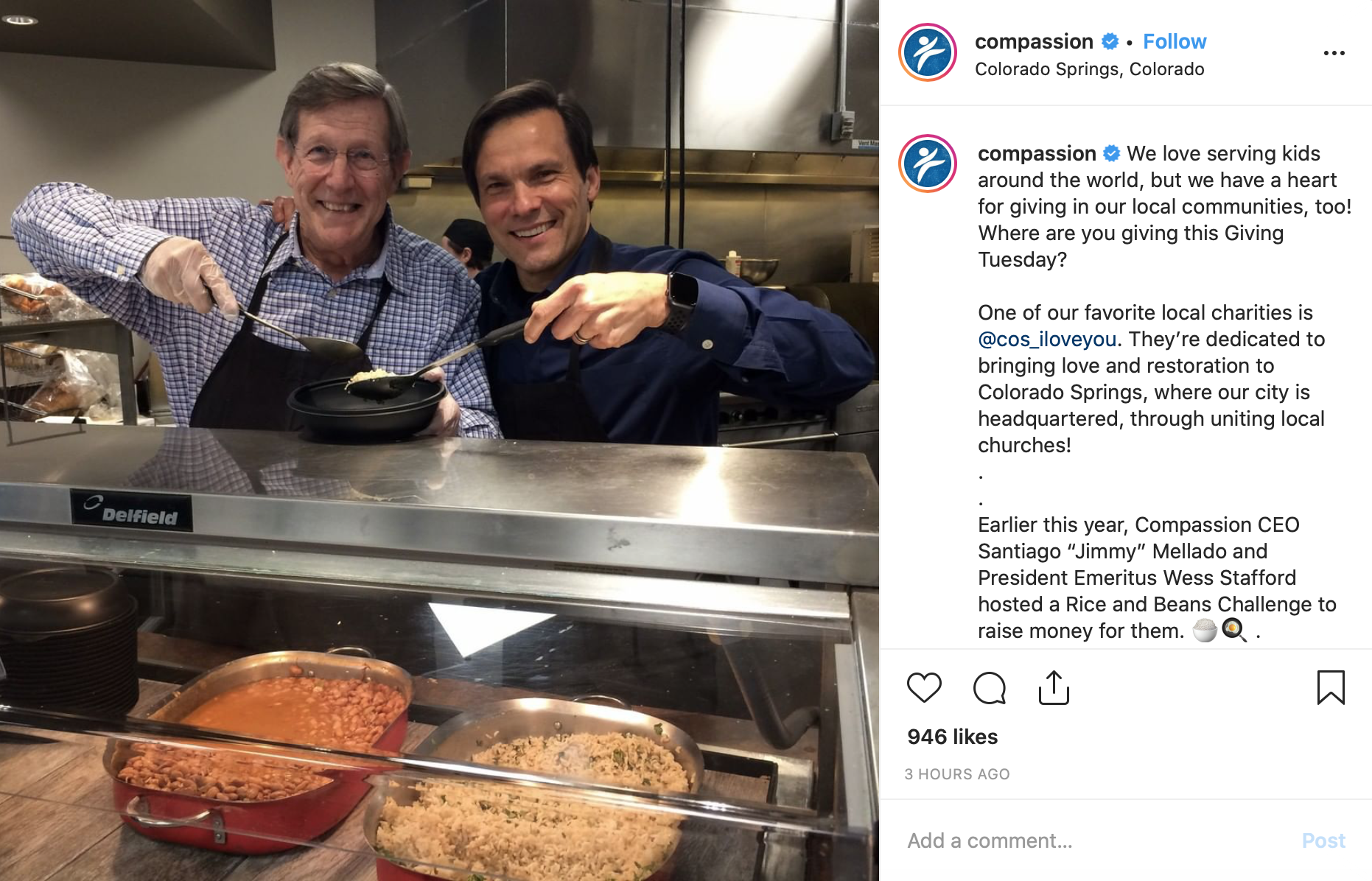 Even nonprofits are giving back. Compassion International’s president, Santiago “Jimmy” Mellado, and President Emeritus, Wess Stafford, came together to serve their local food pantry in Colorado Springs with a rice and bean challenge.