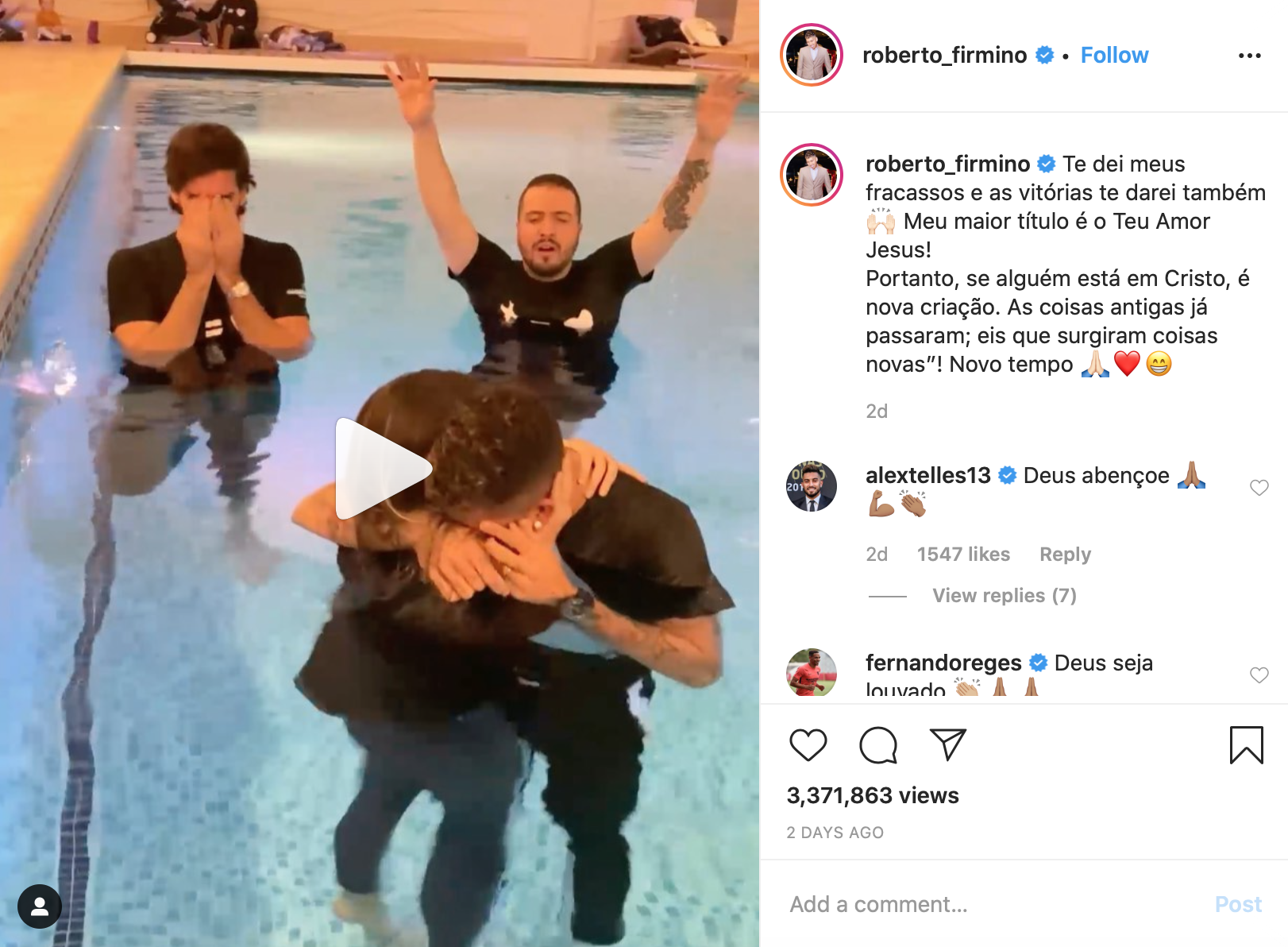 Brazilian soccer player Roberto Firmino recently shared a touching video of himself being baptized to his Instagram page – the video has been viewed more than three million times.