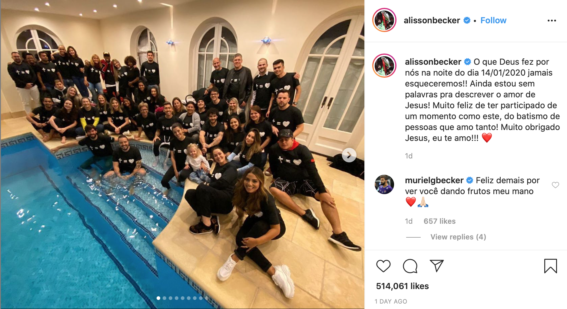 Also baptized that day was fellow Brazilian Liverpool soccer player Alisson Becker. While Becker did not share a video of his baptismal experience, he did post a carousel of photos from the event to his Instagram page Thursday, praising Jesus in the caption. He wrote in Portuguese, “What God has done for us on the night of 14/01/2020 we will never forget!! I am still speechless to describe the love of Jesus! Very happy to have participated in a moment like this, the baptism of people I love so much! Thank you so much, Jesus, I love you!!!”