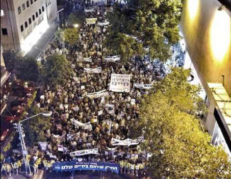 Miles de personas se agolparon en el parque Meir del centro de Tel Aviv y marcharon con tambores bajo el eslogan “Está en nuestras manos”.