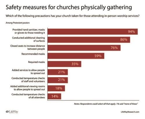 For those churches choosing to meet physically indoors, 99% point to some type of health and safety precaution they are taking.