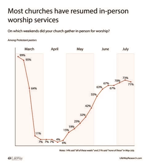 At the start of the COVID-19 outbreak, according to previous surveys from Nashville-based LifeWay Research, Protestant churches across the U.S. stopped gathering in-person in a matter of weeks.