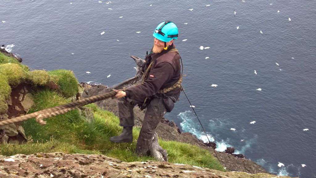 Image caption Carrying the rope out to the bird cliffs takes a strong team