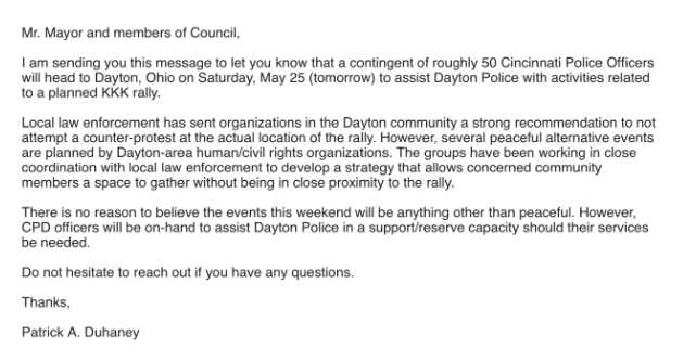 DAYTON, Ohio (WCPO) — A contingent of 50 Cincinnati Police Department officers will spend Saturday in Dayton, Ohio, at the scene of a planned Ku Klux Klan rally and nearby counter-protests, according to an email sent Friday from Cincinnati City Manager Patrick Duhaney to members of city council. “There is no reason to believe the events this weekend will be…