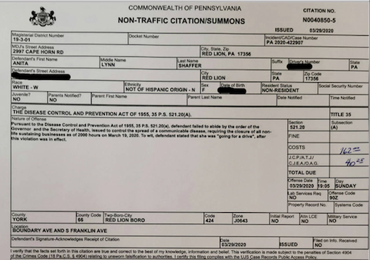 They cited her for violating Gov. Tom Wolf’s stay-at-home order that took effect in York County two days before.