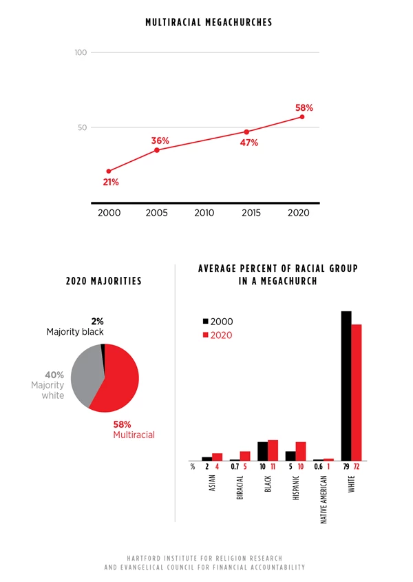 American megachurches are more racially and ethnically diverse than ever, according to a new study from sociologists Warren Bird and Scott Thumma. The majority of the country’s roughly 1,750 megachurches are now multiracial (defined as 20 percent or more of a congregation belonging to a minority group).