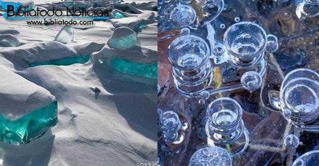 Burbujas de gas metano congeladas bajo la superficie del agua.