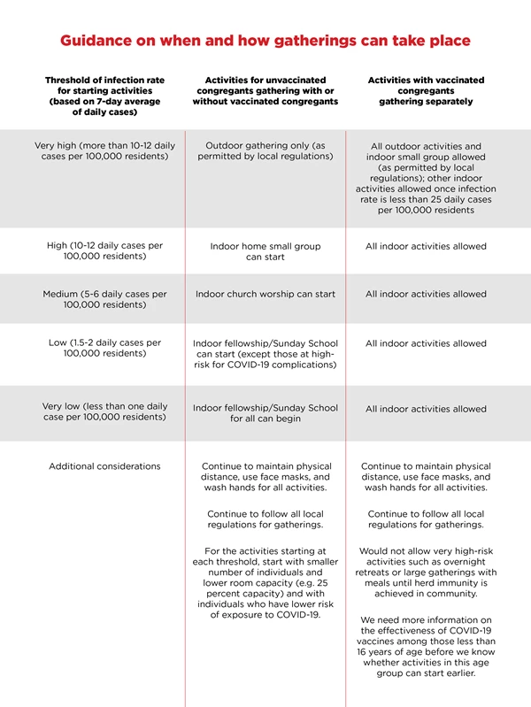 As more information becomes available or clearer guidelines emerge, the thresholds in the table may need to be adjusted. Churches may choose slightly higher or lower thresholds for starting activities. With the fast-spreading variants, it is even more important to start activities at each threshold with a smaller number of individuals. Given that infection rates have skyrocketed in the last few months in many areas, it will be a while before infection rates decline to a level that will permit indoor gatherings for unvaccinated congregants.