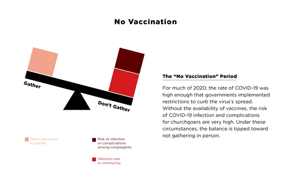 Explicitly stated or not, church leaders are balancing three factors when they consider church gathering during this pandemic: the need and desire of congregants to gather, the rate of COVID-19 infection in the community, and the risk of COVID-19 infection and complications among the church’s congregants. I created three figures to describe how these factors of churches gathering influence three vaccination periods: